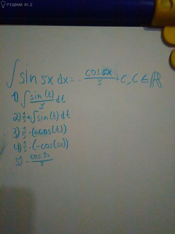 u=5x du=(5x)`dx du=5dx ⇒ dx=(1/5)du [b]∫ sin5xdx[/b]= ∫ sinu*(1/5)du=(1/5) ∫ sinudu=(1/5)(-cosu)+C=[b](1/5)*(-cos5x)+C[/b]