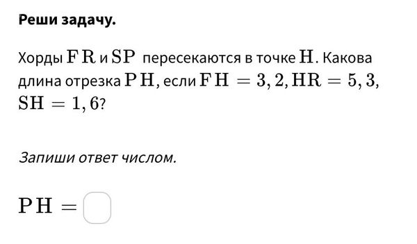 Хорды FR и SР пересекаются в точке Н. Какова длина отрезка РН, если FН = 3,2, HR = 5, 3, SН = 1,6?