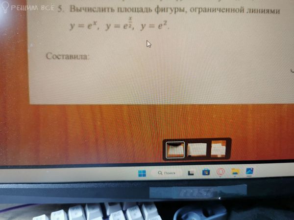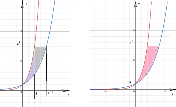 [m]S= ∫ _{0}^{2}(e^{x}-e^{\frac{x}{2}})dx+ ∫ _{2}^{4}(e^{2}-e^{\frac{x}{2}})dx=(e^{x}-2e^{\frac{x}{2}}| _{0}^{2}+(e^{2}x-2e^{\frac{x}{2}}|_{2}^{4}=(e^2-1-2e+2)+(4e^2-2e^2-2e^2+2e)=e^2-1[/m]