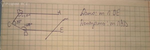 Прямая m пересекает прямую DE. А если прямая пересекает одну из двух параллельных прямых, то она пересекает и другую прямую, значит, m пересекает АВ, что и требовалось доказать.