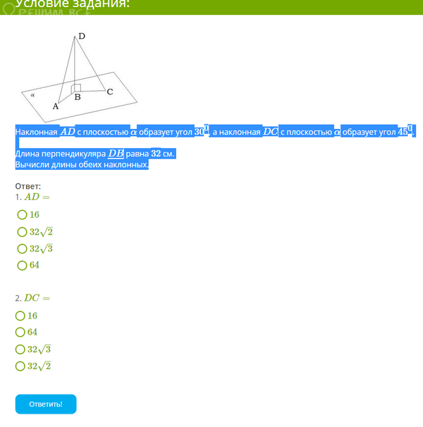 Наклонная AD с плоскостью α образует угол 30, а наклонная DC с плоскостью α образует угол 45. Длина перпендикуляра DB равна 32 см. Вычисли длины обеих наклонных.