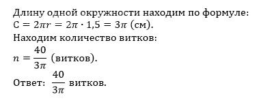 На катушку, радиус которой равен 1,5 см, намотано 40 см нитки. Сколько было сделано витков? Відповіді: 40/π, 40/3π, 120π, 80/3π