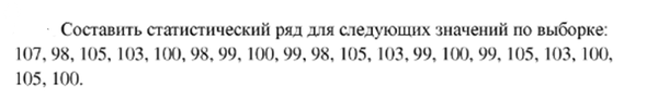 Составить статистический ряд для следующих значений по выборке: 107, 98, 105, 103, 100, 98, 99, 100, 99, 98, 105, 103, 99, 100, 99, 105, 103, 100, 105, 100.
