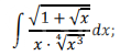 [m] ∫ \frac{\sqrt{1+\sqrt{x}}}{x\cdot\sqrt[4]{x^3}}dx= -∫8t^5dt=-8\frac{t:^6}{6}+C=-\frac{4}{3}(\sqrt[4]{\frac{1+\sqrt{x}}{\sqrt{x}}})^6+C=-\frac{4}{3}\frac{(1+\sqrt{x})^{\frac{3}{2}}}{x^{\frac{3}{4}}}+C[/m]