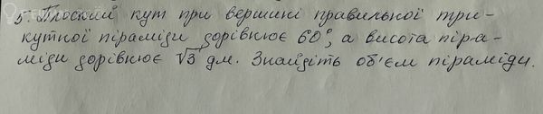 V=(1/3)*S_(осн)*Н=(1/3)*(1/2)*(x^2)*sin60 ° *sqrt(3)=9/8