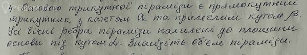 V=(1/3)*(1/4)a^2*(1/cos β )*(a/(2cos β ))*tg α =(1/24)*a^3*tg α /cos^2 β
