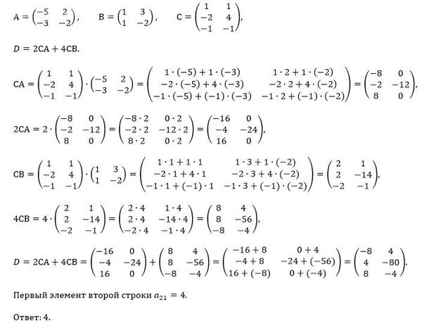 Найдите матрицу D=λCA+μCB, если A=[−5−32−2],B=[113−2],C=⎡⎣⎢1−2−114−1⎤⎦⎥, λ=2,μ=4. В ответ введите значение первого элемента 2-oй строки матрицы D.