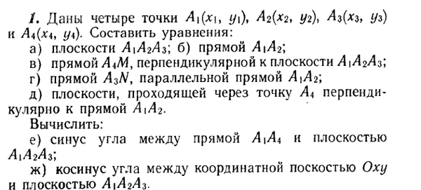 1. Даны четыре точки. Составить уравнения: а) плоскости A1A2A3; 6) прямой А1A2; в) прямой А4М, перпендикулярной к плоскости А1А2А3; ....