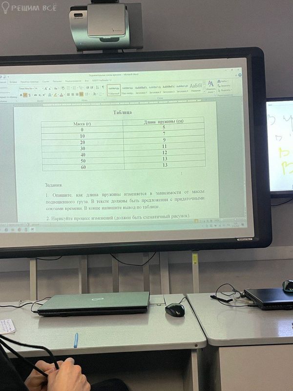 1. Опишите, как длина пружины изменяется в зависимости от массы подвешенного груза. В тексте должны быть предложения с придаточными союзами времени. В конце напишите вывод по таблице.
