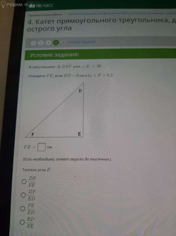 В треугольнике DEF ∠ Е = 90°. Определи FE, если ED =9 см и tg острого ∠ F =0,2 FE= (Если необходимо, ответ округли до тысячных) Тангенс ∠ F: