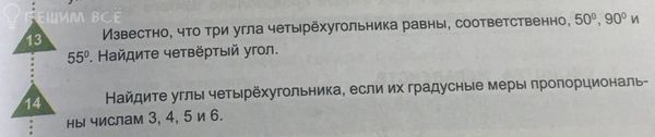 13. Четвертый угол равен: 360° - 50° - 90° - 55° = 165°