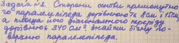 Сторони основи прямокутного паралелпіпеда дорівнюють 8см и 15см а площа його діагонального перерізу дорівнює 340 см2. знайти бічну поверхню паралелепіпеда