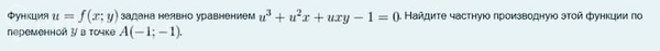 Функция u = f(x;y) задана неявно уравнением u^3+u^2*x+u*x*y-1 = 0. Найдите частную производную по переменной y в точке А(-1;-1)