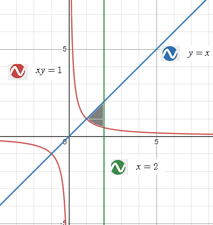 найти объем тела, образованного вращением вокруг оси ох фигуры, ограниченной линиями ху=1; у=х; x=2