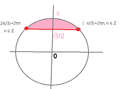 (π/3)+2πn ≤ (x/2) ≤ (2π/3)+2πn, n ∈ Z см. рис. Умножаем на 2: [b](2π/3)+4πn ≤ x ≤ (4π/3)+4πn, n ∈ Z[/b]