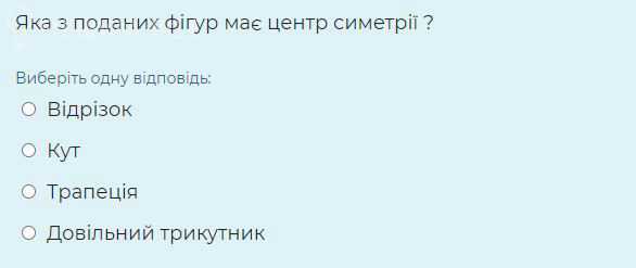 Отрезок точно имеет центр симметрии, это его середина. Трапеция, угол и Треугольник центра симметрии не имеют. Треугольник не имеет центра симметрии, даже если он равносторонний.