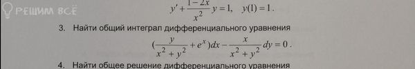 [m]\frac{∂ u}{ ∂ x}=P(x;y)[/m] ⇒ [b]u(x;y)[/b]= [m]∫ P(x;y) dx= ∫( \frac{y}{x^2+y^2}+e^{x})dx=y\cdot \frac{1}{y}arctg\frac{x}{y}+e^{x}[/m]+ [b]φ (y)[/b]=[m]arctg\frac{x}{y}++e^{x}[/m] [b]φ (y)[/b]