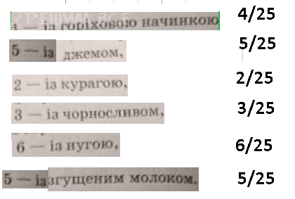 Задача по алгебре.Розв'язати завдання ! в/дправити на перев!рку 1,2,3,4 ощнюеться 3 бали, якщо виконано розрахунки або надано пояснення, а не тльки в/дпов!д!. 3 —р 3 -l начинки У коробц! лежать 25 цукерок, 18 них 4 — 18 ropi]:mn Зя джемом, 2 — 13 курагою, 3 — 13 чорносливом, 0/ !Ум% реш щеним молоком. AR [ 1) Мар!чка хоче взяти одну цукерку — 13 джещ{! я‘ о Склльки 1снуе способ!в зд!йснити й бажання? — b X Пук 2) Яка ймов!рн1сть того, що навмання взята 3 коробіі!: ›; Il Ve щеним молоком? sy й8 3) Подайте дан! про цукерки, що лежать у “-с'›‹".г „!;: ВИГЛя 4) Подайте дан! про цукерки, що лежать в коробц,, у вигляд! частотно! таблиц!.