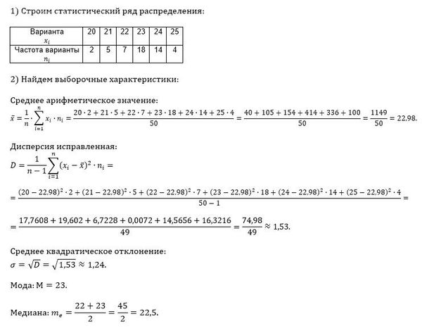 Сославьте ряд распределения. Найдите числовые характеристики выборки. Учет количества изготовленных за смену деталей 50 рабочими цеха дало следующие результаты:
