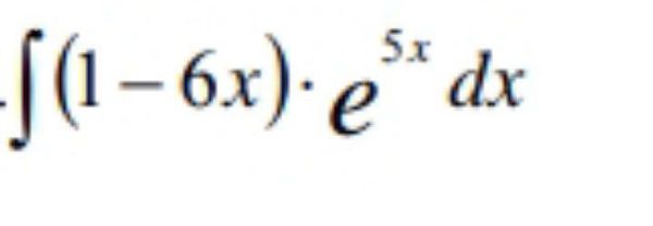 По частям u=[b]1-6x[/b] [u]du=-6dx[/u] [blue]dv=e^(5x)dx[/blue] v=(1/5)*e^(5x) ∫ (1-6x)*e^(5x)dx=[b](1-6x)[/b]*(1/5)*e^(5x) - ∫[blue](1/5)*e^(5x) [/blue]*[u] ( -6dx)[/u]=(1/5)*(1-6x)*e^(5x)+(6/5)*(1/5)e^(5x)+C