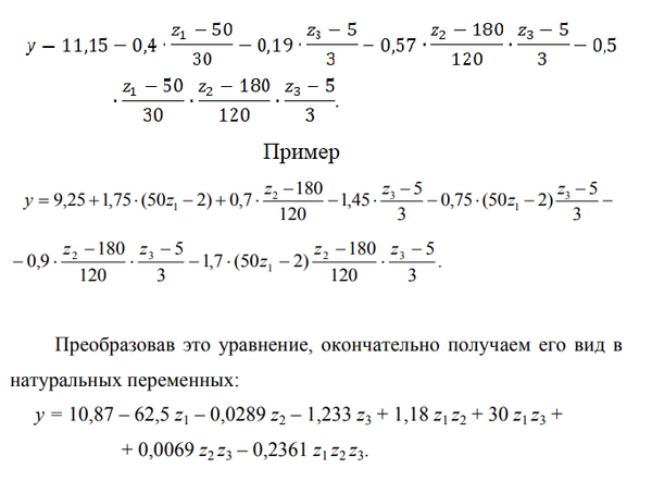 [m]y=11,15-\frac{0,4}{30}Z_{1}+\frac{0,4\cdot 50}{30}-\frac{0,19}{3}Z_{3}+\frac{0,19\cdot 5}{3}-0,57\cdot (\frac{Z_{2}Z_{3}-180Z_{3}-5Z_{2}+900}{120\cdot 3})-0,5 \cdot (\frac{Z_{1}Z_{2}Z_{3}-180Z_{1}Z_{3}-5Z_{1}Z_{2}+900Z_{1}-50Z_{2}Z_{3}+9000Z_{3}+250Z_{2}-45000}{30\cdot 120\cdot 3})[/m]