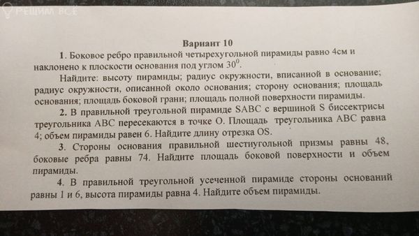 1. Боковое ребро правильной четырехугольной пирамиды равно 4см и наклонено к плоскости основания под углом 30° Найдите: высоту пирамиды; радиус окружности, вписанной в основание; радиус окружности, описанной около основания; сторону основания; площадь основания; площадь боковой грани; площадь полной поверхности пирамиды 2. В правильной треугольной пирамиде SABC с вершиной $ биссектрисы треугольника АВС пересекаются в точке ©. Площадь треугольника АВС равна 4; объем пирамиды равен 6. Найдите длину отрезка ©5. 3. Стороны основания правильной шестиугольной призмы равны 48, боковые ребра равны 74. Найдите площадь боковой поверхности и объем пирамиды. 4. В правильной треугольной усеченной пирамиде стороны оснований равны 1 и 6, высота пирамиды равна 4. Найдите объем пирамиды.