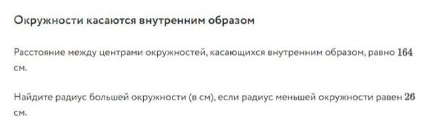 Окружности касаются внутренним образом Расстояние между центрами окружностей, касающихся внутренним образом, равно 164 см. Найдите радиус большей окружности (в см), если радиус меньшей окружности равен 26 см