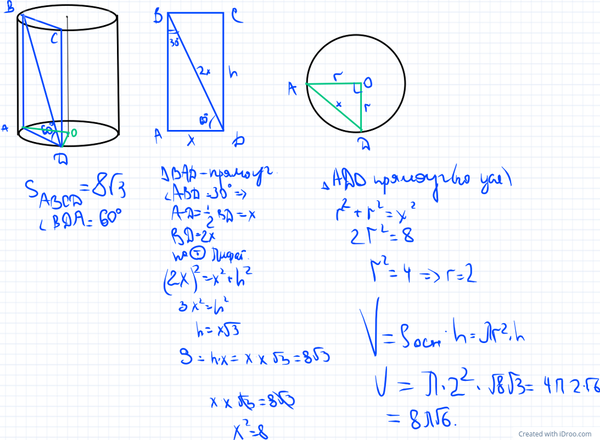 В цилиндре параллельно оси проведено сечение, пересекающее основание по хорде, видно из центра этого основания под прямым углом. Образовавшаяся площадь деререза равна 8√3 см2, а угол наклона диагонали сечения к плоскости основания равен 60°. Найдите объем цилин– дро.