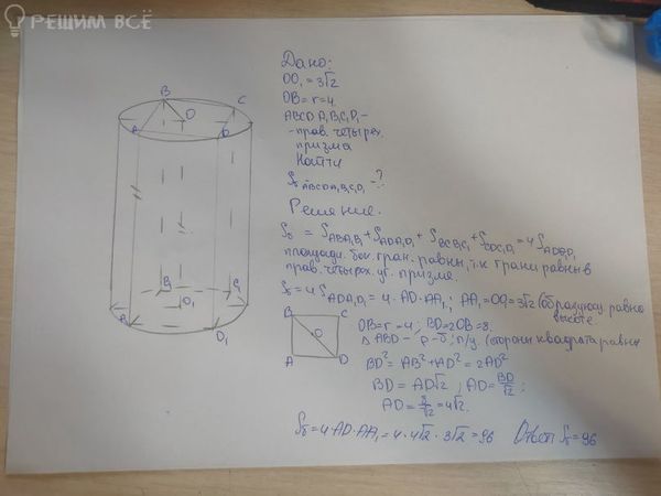 В цилиндр, радиус основания которого равен 4 см, а высота – 3√2 см, вписана правильная четырехугольная призму. Найдите площадь боковой поверхности призмы.