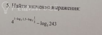 [m]4^{1-log_{2}1,5-log_{2}\frac{1}{3}}-log_{3}243=16-5=11[/m]