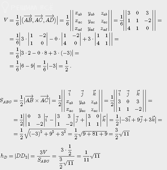 Даны вершины тетраэдра A(0, 0, 2), B(3, 0, 5), C(1, 1, 0) и D(4, 1, 2). Вычислить длину высоты, опущенной из вершины D на грань ABC.