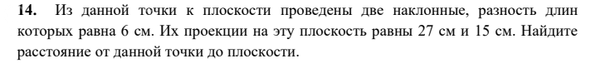 14. Из данной точки к плоскости проведены две наклонные, разность длин которых равна 6 см. Их проекции на эту плоскость равны 27 см и 15 см. Найдите расстояние от данной точки до плоскости.
