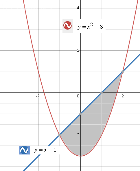 [m]S= ∫ ^{2}_{-1}(x-1-(x^2-3))dx= ∫ ^{2}_{-1}(x-x^2+2)dx=(\frac{x^2}{2}-\frac{x^3}{3}+2x)|^{2}_{-1}=\frac{2^2}{2}-\frac{2^3}{3}+2\cdot 2)-(\frac{(-1)^2}{2}-\frac{(-1)^3}{3}+2\cdot (-1))=[/m]