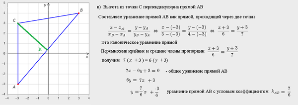 Даны вершины треугольника ABC: A(-3;-3); B(3;4); C(-3;3). Найти а) длину стороны AB; б) внутренней угол А; в) уравнение высоты, проведенной из вершины C; г) уравнение медианы, проведенной к стороне AB; д) точку пересечения медиан треугольника; е) длину высоты, опущенной из вершины C; ж) площадь треугольника ABC.