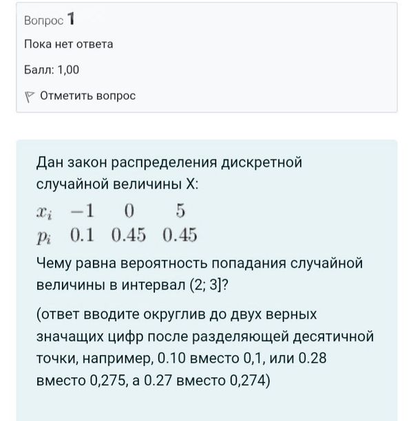 Дан закон распределения дискретной случайной величины Х: z; -1 0 5 p 0.1 045 0.45 Чему равна вероятность попадания случайной величины в интервал (2; 3]? (ответ вводите округлив до двух верных значащих цифр после разделяющей десятичной точки, например, 0.10 вместо 0,1, или 0.28 вместо 0,275, а 0.27 вместо 0,274)