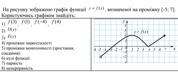 1) f(3)=1, f(1)=2, f(-4)=-1,1, f(4)=0; 2) D(y)=(-5; 7]; 3) E(y)=(-2; 2]; 4) y<0 при х ∈ (-5; -3), y>0 при х ∈ (-3; 4) и (4;7].