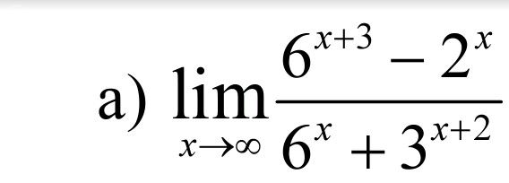 [m]=\lim_{ \to+ \infty }\frac{6^{x}(6^3-(\frac{2}{6})^{x}}{6^{x}(1+9\cdot( \frac{3}{6})^{x})}=[/m]