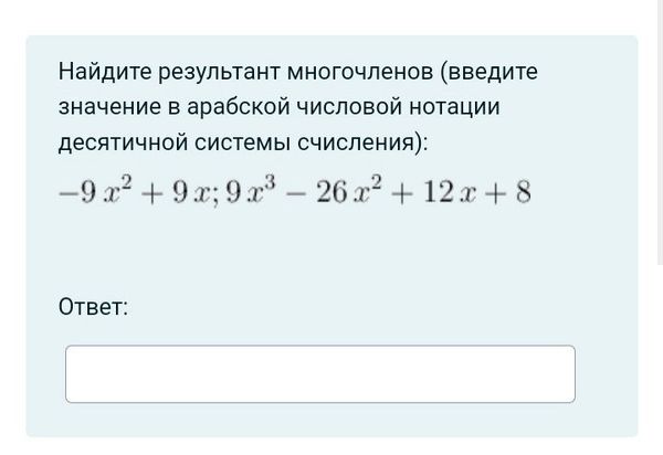 Найдите результант многочленов (введите значение в арабской чИслоВой нотации ДеСЯТИЧНОЙ системы СЧИСПЕНИЯ)...