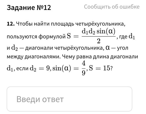 Ну у вас же всё дано, осталось только подставить! S = d1*d2*sin(a)/2 15 = d1*9*(4/9)/2 = d1*(9*4)/(9*2) = 2*d1 d1 = 15/2 = 7,5