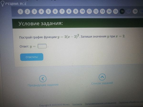 Построй график функции у=2(x-2)^2. Запиши значения у при x=2