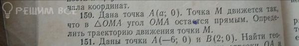 чала координат, Ё 150. Дана точка А (а; 0). Точка М движется 1ak что в АОМА угол ОМА остамся прямым, Опреде @ ) лить траекторию движения точки M. T я 151. Даны точки А (—6; 0) и В(2;0). Найтим е