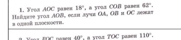 1. Угол АОС равен 18°, а угол СОВ равен 62°. Найдите угол АОВ, если лучи ОА, ОВ и ОС лежат в одной плоскости. o e РОС павен 40°. а угол ТОС равен 110°.