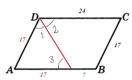 в параллелограмме abcd проведена биссектриса угла d которая пересекает сторону ab в точке o так что ao 17 см ob 7см