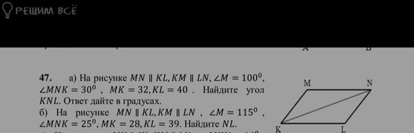 6) Hа рисунке MN || KL, KM || || LN angle M = 115 ^ 0 angle MNK = 25 ^ 0 MK = 28 KL = 39 Найдите NL.
