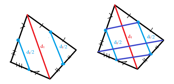 Найдите периметр четырёхугольника постоянного на средних линиях, если диагонали фигуры = 5 и 13.