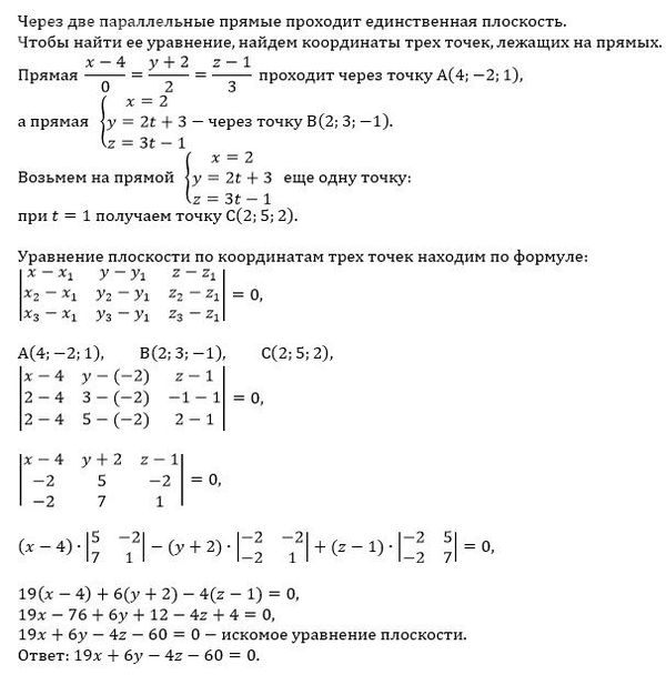 Составить уравнение плоскости, проходящей через две параллельные прямые
