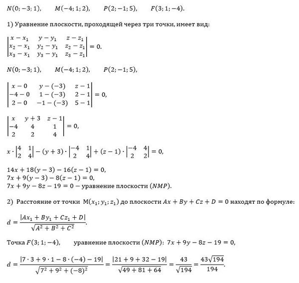 плоскость в системе координат. Данные: N(0;–3;1), M(–4;1;2), P(2;–1;5), F(3;1;–4)