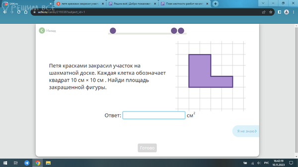 Петя красками закрасил участок на шахматной доске. Каждая клетка обозначает квадрат 10 см х 10 см . Найди площадь закрашенной фигуры.