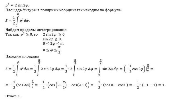 Вычислить площадь фигуры, ограниченной линиями: p^2 = 2*Sin(2ф)