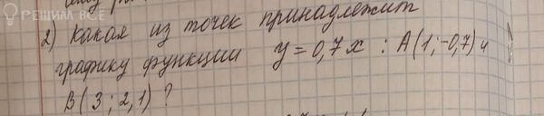 y = 0,7x; A(1; -0,7); B(3; 2,1) Подставляем x в функцию и смотрим, получится ли y. 1) y(1) = 0,7*1 = 0,7 ≠ -0,7 Значит, точка А не принадлежит графику. 2) y(3) = 0,7*3 = 2,1 Значит, точка B принадлежит графику.